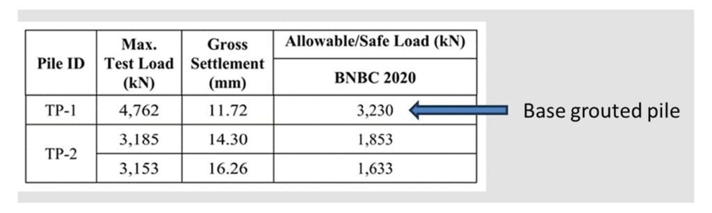 As part of the foundation design verification, two test piles of 750mm diameter and 98 feet depth were constructed. Among them, one pile was executed with base grouting, while the other was tested without grouting. Both piles underwent dynamic load testing to evaluate performance differences.